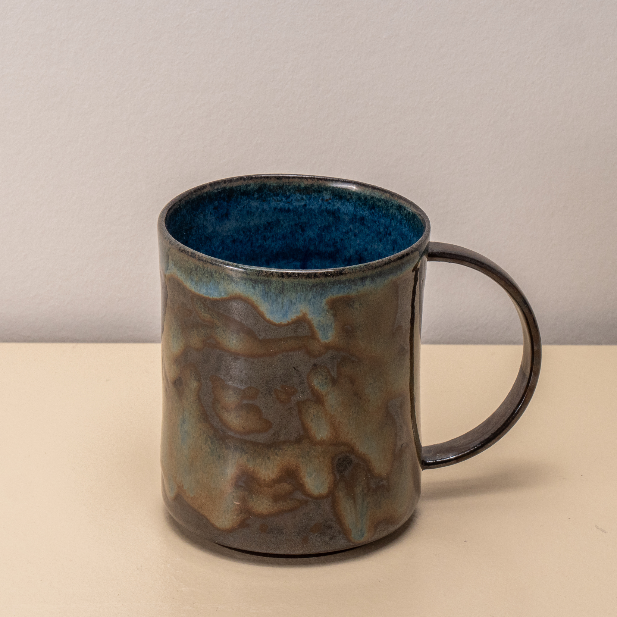 Kop i sort stentøj med blå glasur indeni og sort metal glasur udenpå.