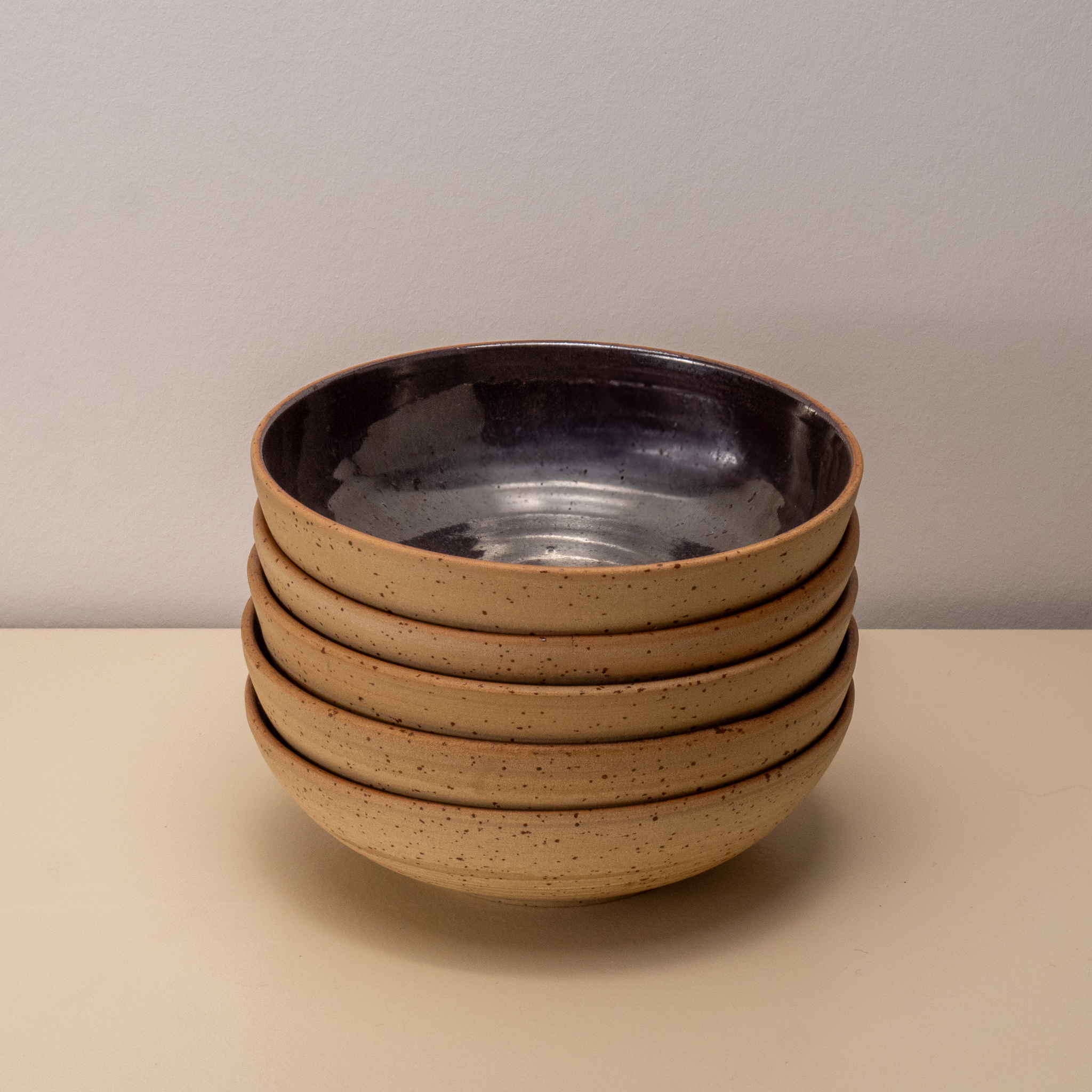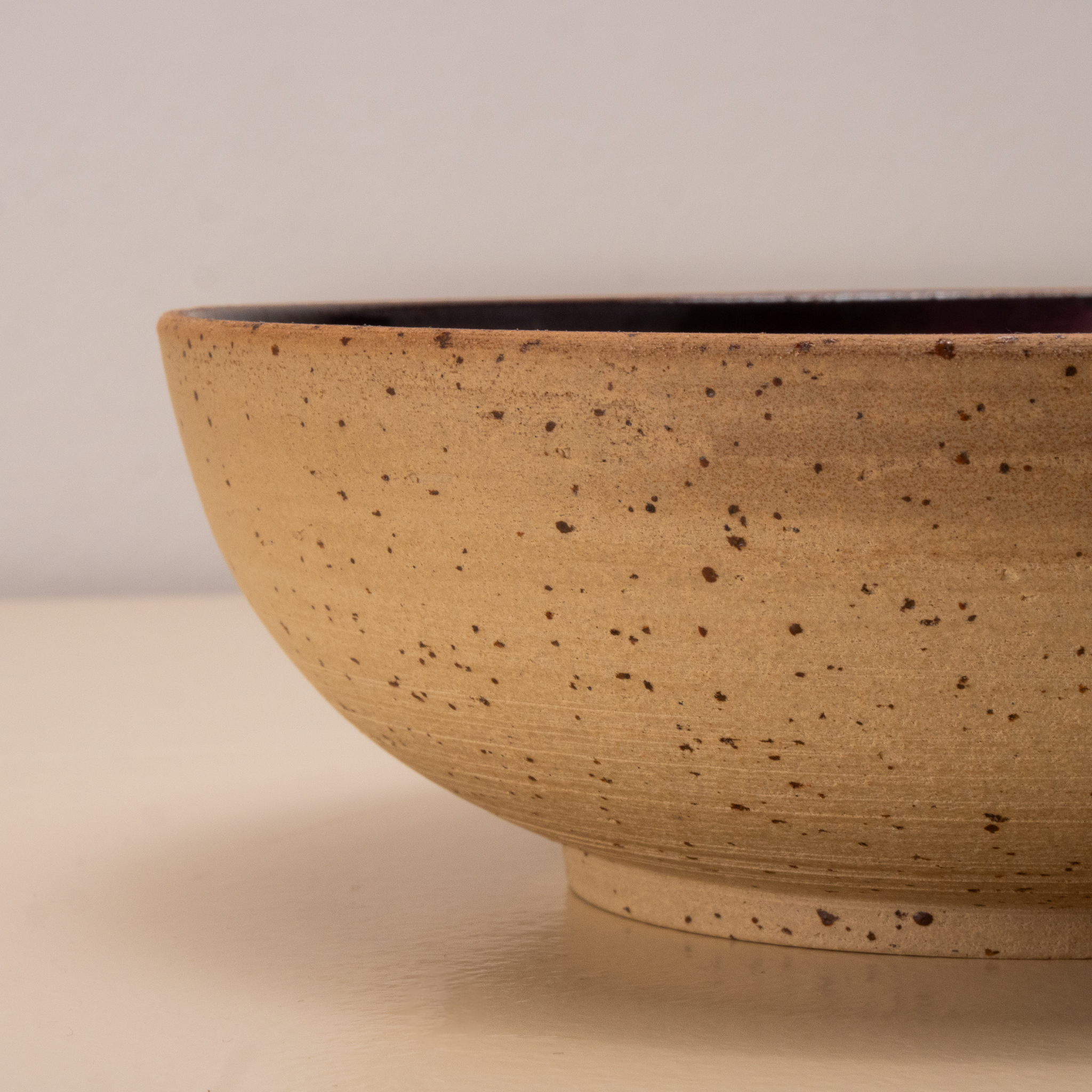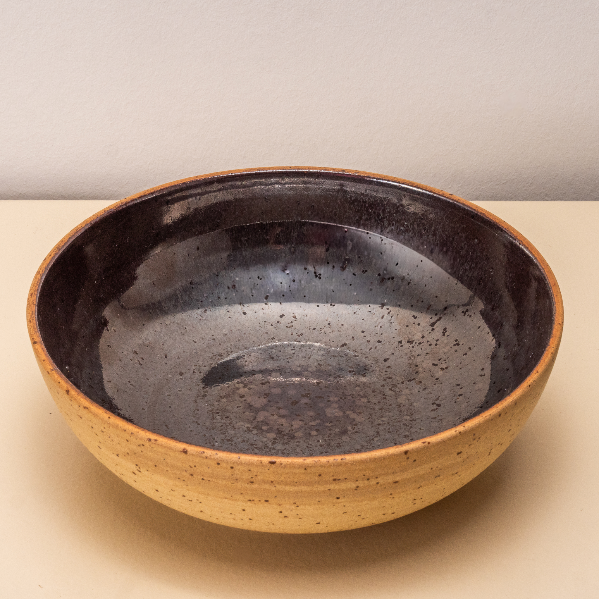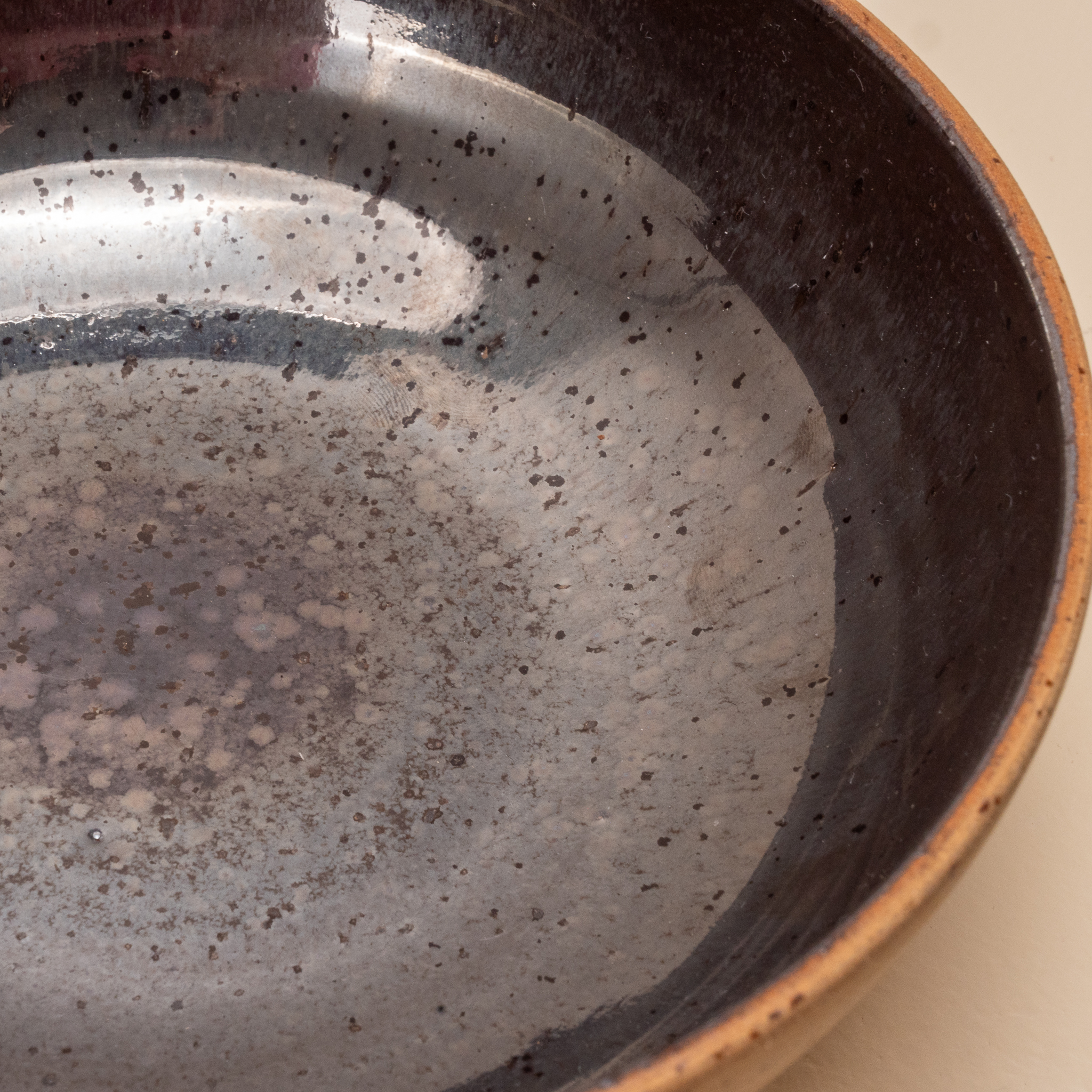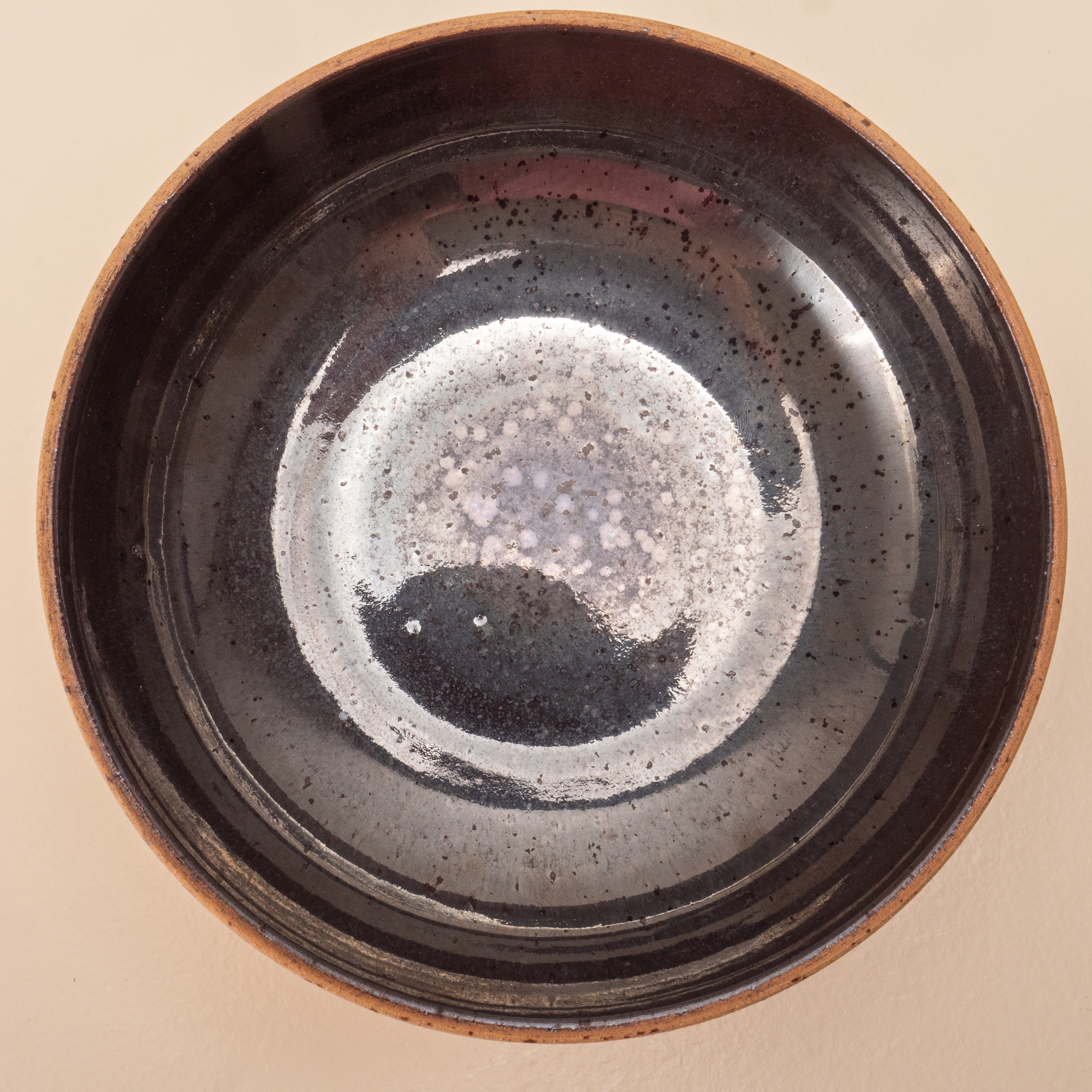Denne skål er kastet med lys ler hvor der er blandet jernstykker i. Jernet kan ikke ses i den rå ler, men skifter farve når skålen brændes til 1250c. Det giver et pisse fedt spil med den sorte metal glasur!
